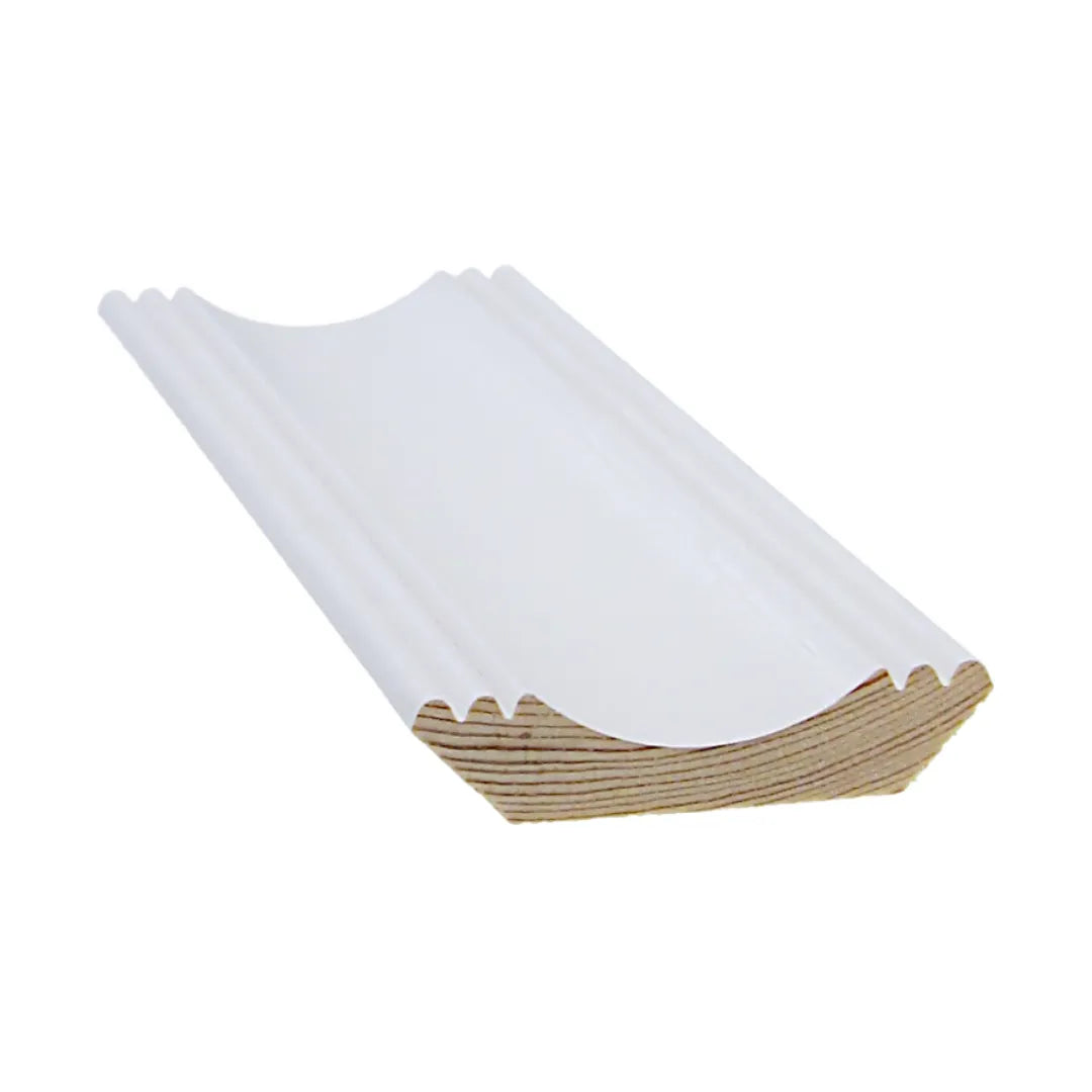 Weiße Zierleiste für die Decke aus wenig astigem Kiefernholz. Diese Zierleiste eignet sich für trockene Räume.