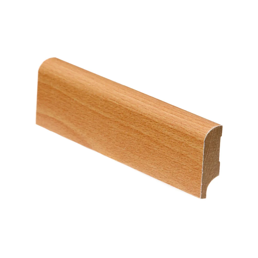 Die MDF-Sockelleiste in Buchenfarbe ist mit widerstandsfähigem Melamin beschichtet, das ein gleichbleibend hochwertiges Produkt ohne Farbunterschiede garantiert.
