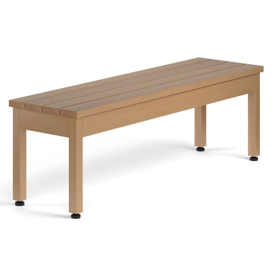 Die Länge der Bank passt sich vollständig den Bedürfnissen des Kunden an, sodass Sie genau die Größe wählen können, die zu Ihrem Raum passt. Die Materialoptionen für die Oberfläche sind Fichte, Espe, Schwarzerle und Thermoespe, die Ihnen die Möglichkeit geben, das gewünschte Naturmaterial auszuwählen. Der Rahmen ist aus demselben Material wie die Oberfläche gefertigt, was ein einheitliches und harmonisches Erscheinungsbild gewährleistet.