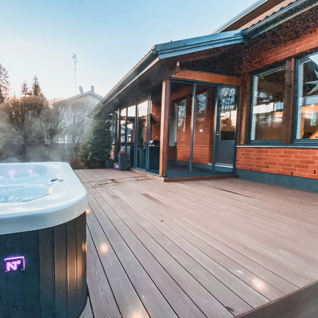 Das Material ist PVC-frei, eine Mischung aus recycelten Holzfasern und recyceltem Kunststoff, die den nördlichen Bedingungen hervorragend standhält und keine Oberflächenbehandlung erfordert.