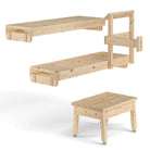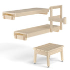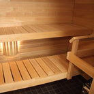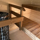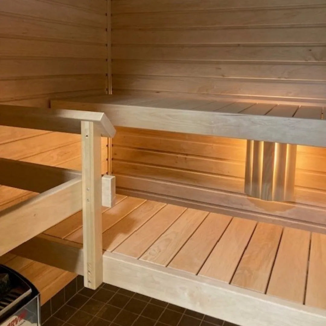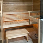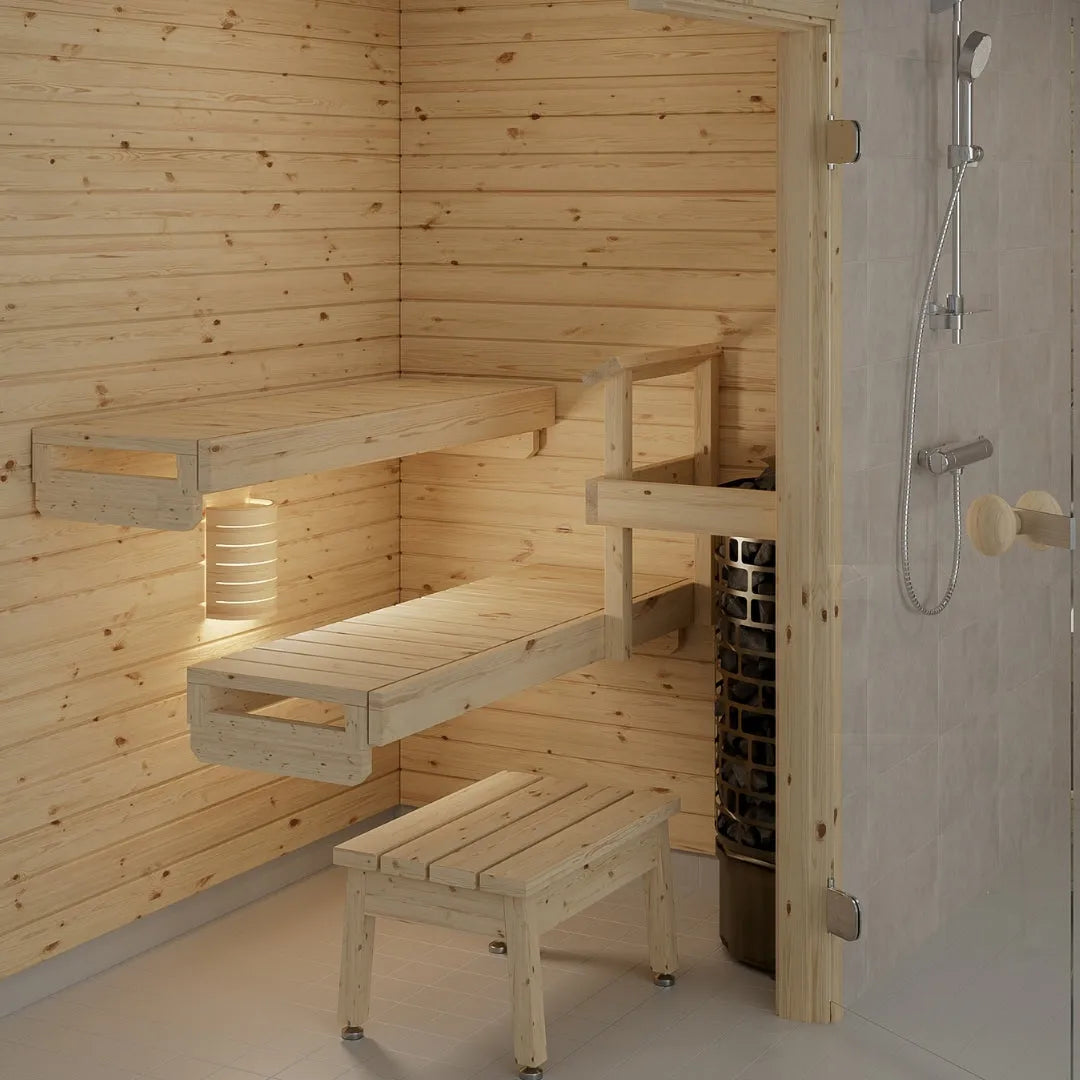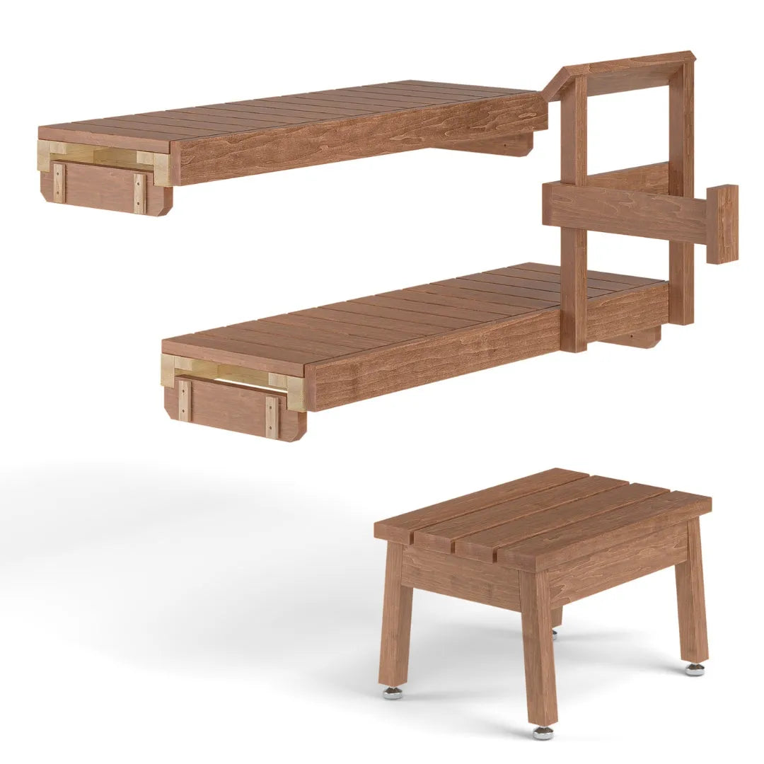 Das Bankpaket enthält neben den Bänken auch einen Hocker, Ofenhandlauf und Bankhalterungen. Die Bankebenen sind zum leichteren Reinigen herausnehmbar gefertigt.