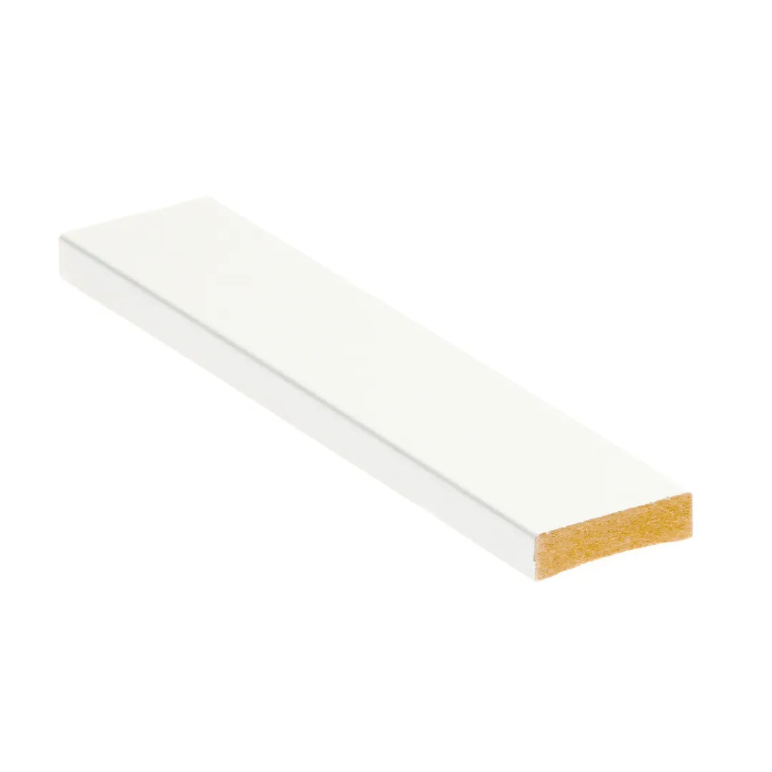 Die weiße MDF-Abdeckleiste ist mit widerstandsfähigem Melamin beschichtet, das ein gleichbleibend hochwertiges Produkt ohne Farbunterschiede garantiert.