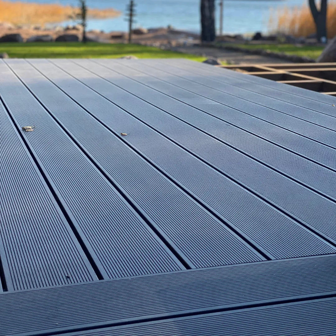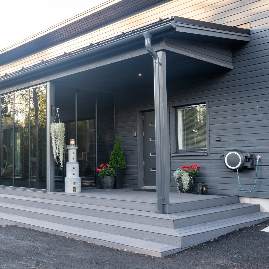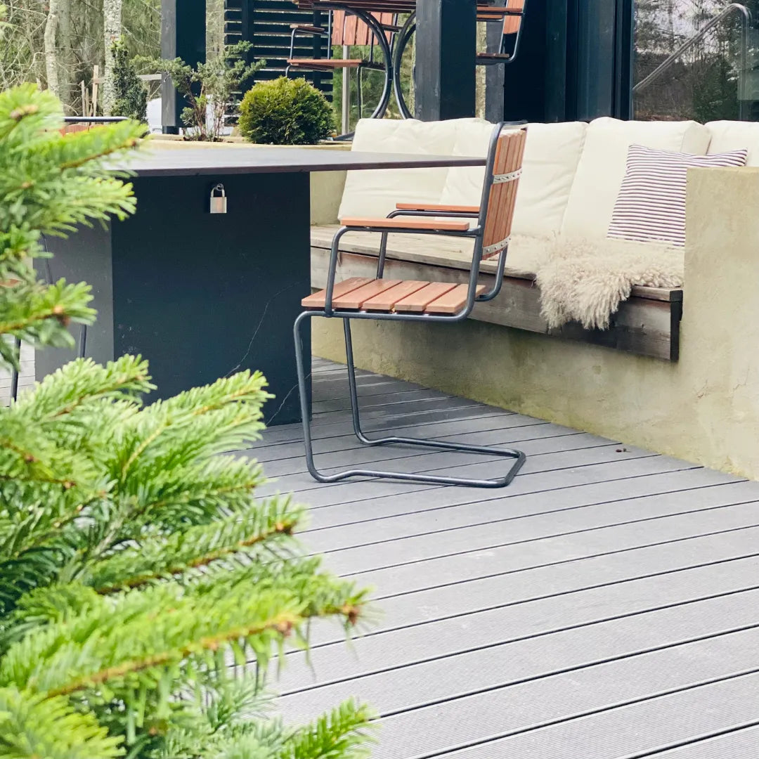 Die neue graue Terrassendiele aus Verbundwerkstoff mit 3D-Muster ist eine einfache Wahl, wenn Sie auf Ihrer Terrasse Haltbarkeit und Pflegeleichtigkeit wünschen. Für die verschiedenen Seiten der Diele können Sie das Profil auswählen, das Ihnen für Ihre Terrasse gefällt – eine sehr authentische Holzimitation oder eine gerillte Oberfläche. Das Material ist PVC-frei, eine Mischung aus recycelten Holzfasern und recyceltem Kunststoff, die den nördlichen Bedingungen hervorragend standhält und keine Oberflächenbehandlung erfordert.