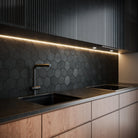 Diese Paneele bestehen aus sorgfältig schwarz gebeiztem Abachi-Holz. Die schwarze Beize unterstreicht die natürliche Schönheit des Holzes und verleiht ihm ein elegantes und modernes Aussehen.